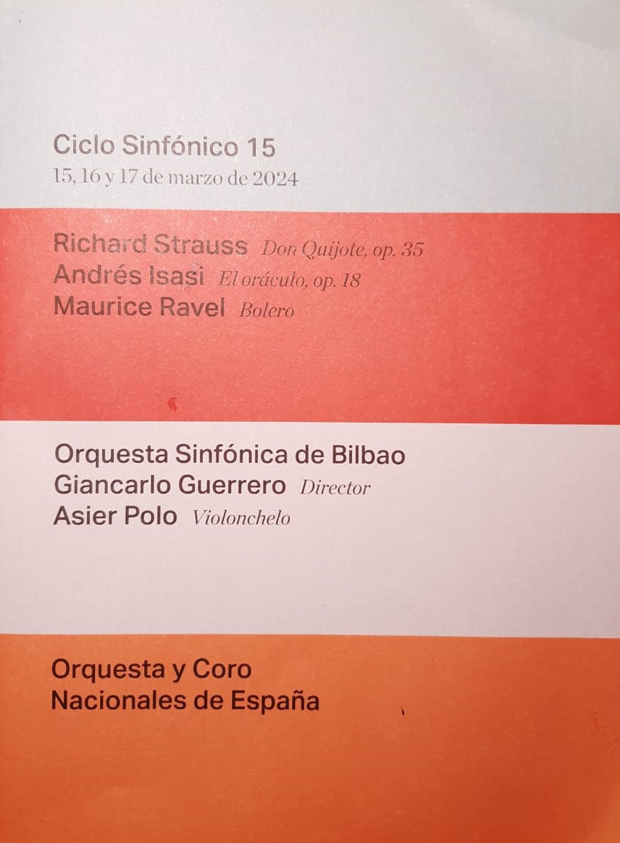 La orquesta que fuimos a ver al Auditorio Nacional era la Orquesta Sinfónica de Bilbao que ofreció su primer concierto en 1922 en el Teatro Arraiga bajo la batuta de Armand Marsick. Ha vivido diferentes etapas, desde los años en los que por sus frecuentes giras era considerada de facto la orquesta del norte de la península, hasta la más reciente expansión internacional que la ha llevado a San Petersburgo, de gira por Japón y a Omán. En 2022, con motivo de su centenario, fue nombrada como "embajadora de Bilbao" y recibió el Premio Sabino Arana. Además de su temporada de conciertos en el Palacio Euskalduna, ofrece ciclos de música de cámara en Bilbao y en Bizkaia, una importante labor pedagógica y actividades de inclusión social mediante la música. Asimismo, participa regularmente en las óperas de la ABAO y ha grabado para Naxos obras de compositores vascos.